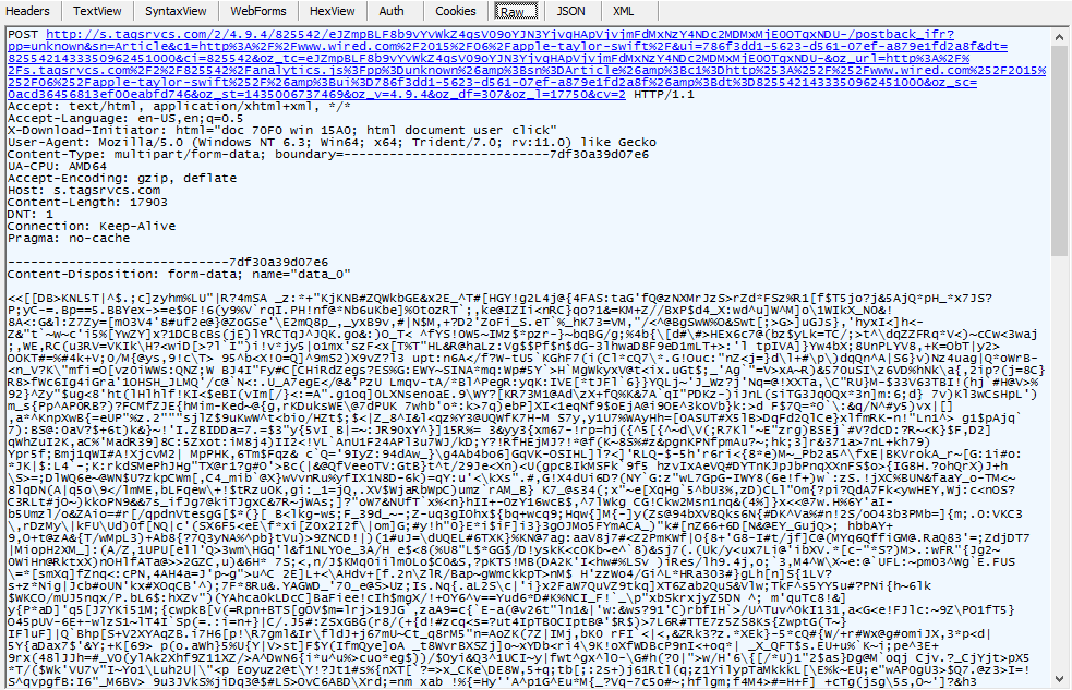 When the IronPort device blocks a response, it returns a HTTP/403 with the body HTML shown in the first screenshot. Now IE’s XSS filter must run to check to see whether any of the content from the request was reflected into the blocking page. Still, the blocking page response is pretty simple… Hmm… let’s look at the request.