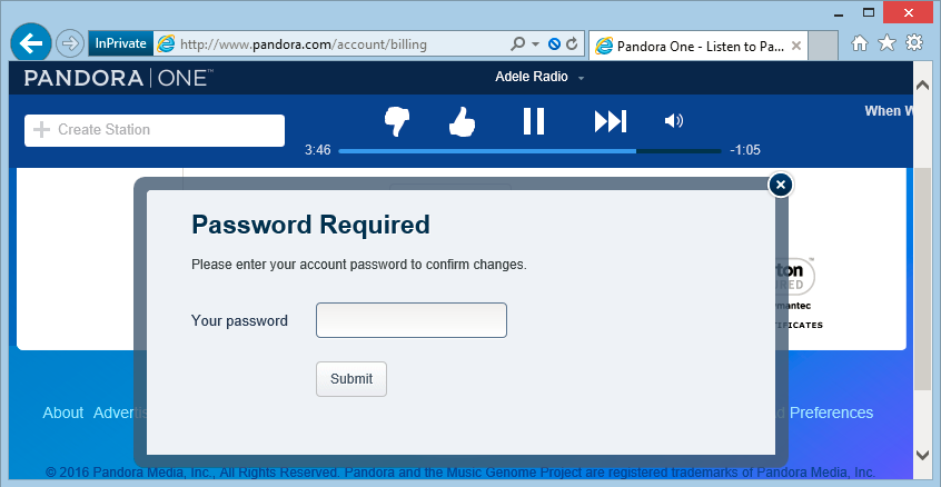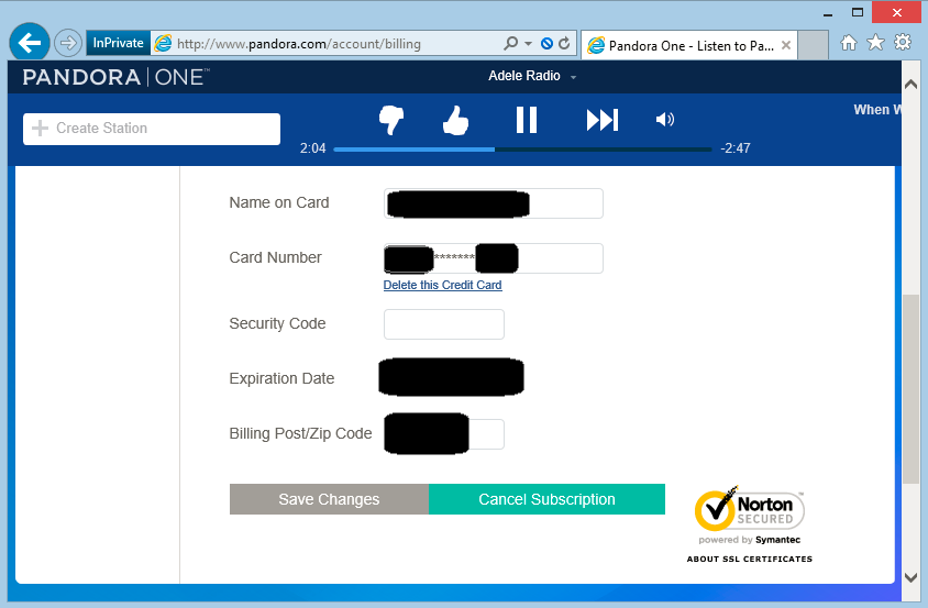 As an added precaution, you can manually load https://pandora.com whenever you make a payment on the site or update your credit card information.