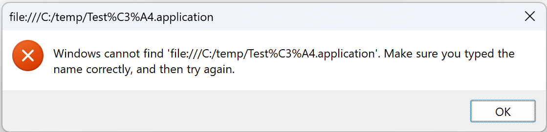 Recently, a user of Edge 120 noted that Edge doesn’t successfully launch ClickOnce applications from file:/// schemed URLs that contain non-English characters. The problem here is that Chromium %-escapes the non-English characters into UTF-8, such that a link to \\server\files\Testä.application is written as file://server/files/Test%C3%A4.application. Unfortunately, for historical reasons, Windows expects %-encoded octets in file URLs to be encoded as %-escaped into the client OS’ ANSI codepage, so for my US-English system, that would be file://server/files/Test%E4.application.