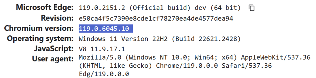 Note: Edge began sanitizing the User-Agent string to zero out all of the sub-build number information in the User-Agent string, such that Edge will now claim e.g. Chrome/106.0.0.0. The Edge team added a new field to the edge://version page to show the upstream version.