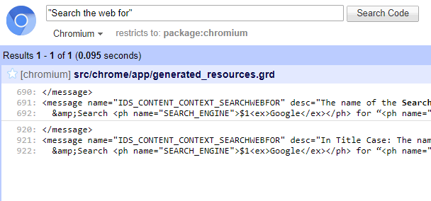 …but there are a gazillion hits, which makes it hard to find what I need. So I instead search for a string that’s elsewhere in the context menu, and find only one hit in the Chromium “grd” (resources) file: