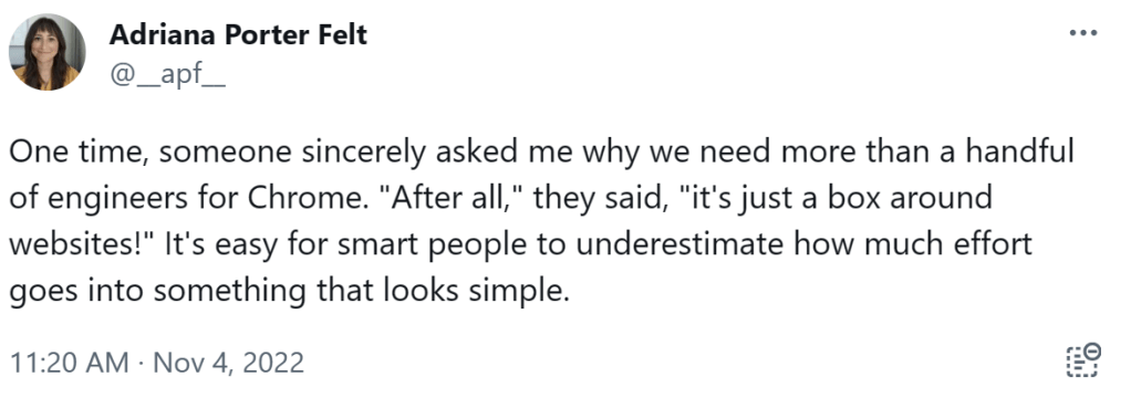 - Alex Russell’s – Alex is a deep thinker about the browser ecosystem and has written many very thoughtful posts about the competitive landscape for browsers.