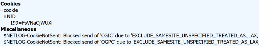If Fiddler sees that cookies were not set or sent due to features like SameSiteByDefault cookies, it will make a note of that in the Session using a psuedo $NETLOG-CookieNotSent or $NETLOG-CookieNotSet header on the request or response: