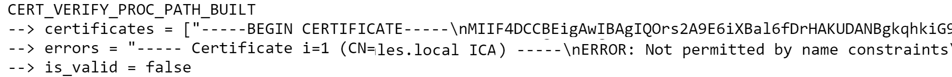 If page loads are failing and showing errors like ERR_CERT_INVALID, a NetLog may provide additional information. Search for type:CERT_VERIFIER to see the events related to validating certificates. In particular, the CERT_VERIFIER_TASK will show errors when a certificate chain is built. For example, this entry notes that the certificate chain was deemed invalid because the Intermediate CA violated Name Constraints requirements specified in the root certificate: