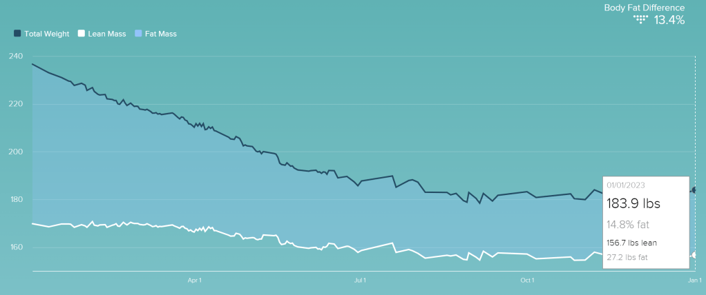 I ended the year 52.7 pounds lighter than I started it, bottoming out at 178.4 pounds in early September before rebounding a bit in the final months of the year. My estimated body fat percentage dropped from a peak of 28.9% to just under 15%.