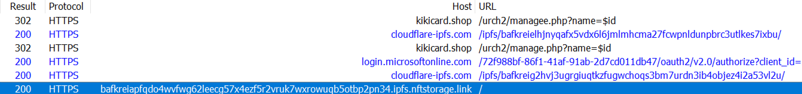 Now, storing data back to IPFS is a somewhat harder challenge for attackers, so this phishing site uses a different server for that purpose. The “KikiCard” URL used by the attackers receives POST requests with victims’ credentials, stores those credentials into a database for the attacker, and then redirects the user to some generic error page on Microsoft.com. In most cases, victims will never even see the “KikiCard” URL anywhere, making it much less likely to be reported.