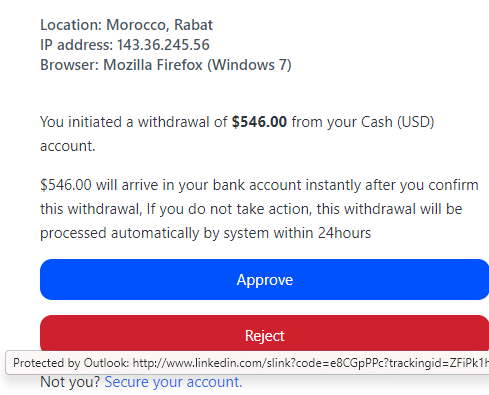 To make their Lure emails’ URLs less suspicious to mail scanners, some phishers will not include a URL that points directly at the credential Request page, instead pointing at a Redirect URL. In some cases, that redirector is provided by a legitimate service, like Google or LinkedIn: