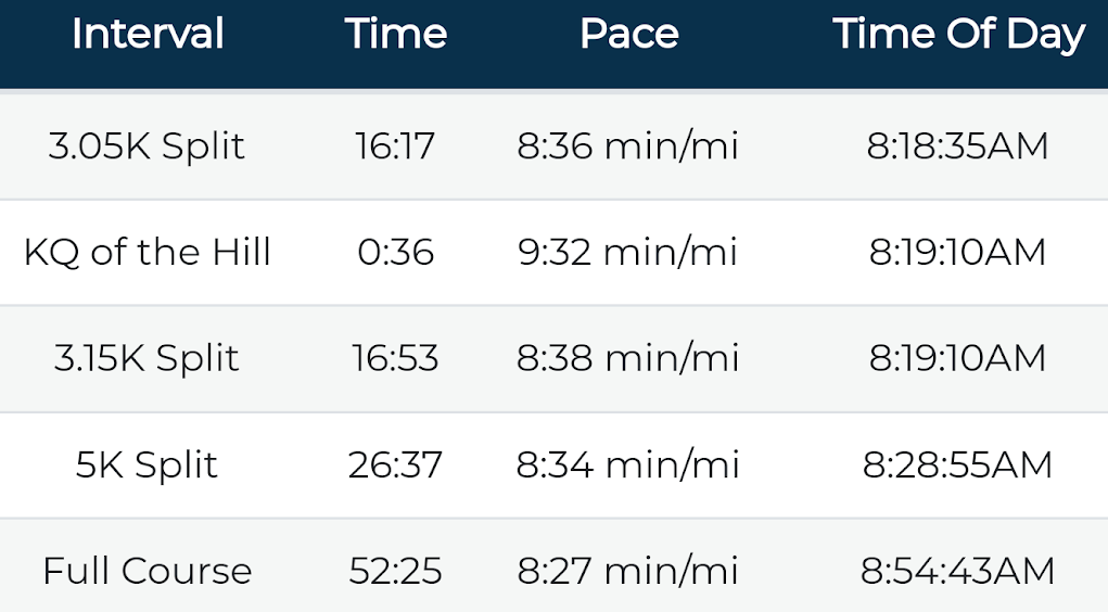 Still, the start felt slow, and avoided looking at my watch until the halfway point, figuring that I’d wait until then to assess the hole I was in and figure out how to react. I was delighted to discover that I hit the 5K mark at almost exactly 27 minutes (27 minutes on my watch, 26:37 on the “chip time”), exactly on track for my “secret” goal of 54 minutes. But now I was excited– could I run a negative split with the second half faster than the first?