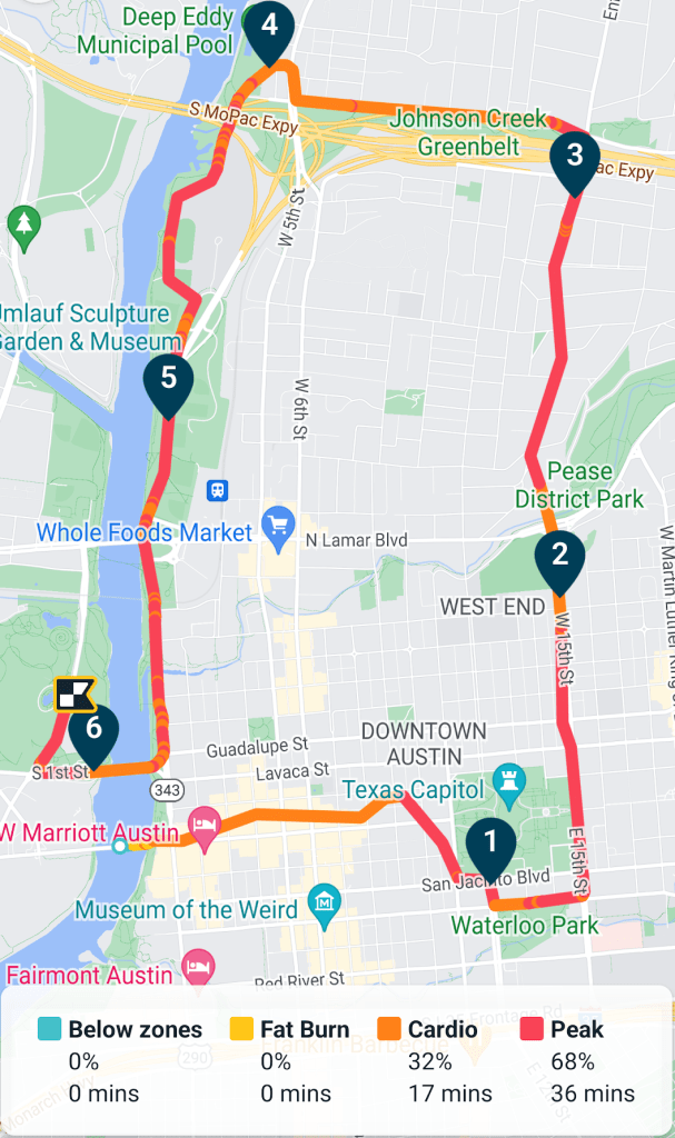 I had three caffeinated Gu energy blocks throughout the race: One at the start, one somewhere around mile 2, and one at mile 5– the last I hadn’t finished by the sprint at the end and I regretted having put it in my mouth at all. I barely drew on my little water bottle and finished the race with more than half of it left. I brought my Amazon Fire phone for music, but discovered that my “fully charged” cheapo Bluetooth headphone was completely dead. I suspect it’s broken. While I was slightly bummed, I figured running for less than an hour without music wouldn’t be bad, and it wasn’t.