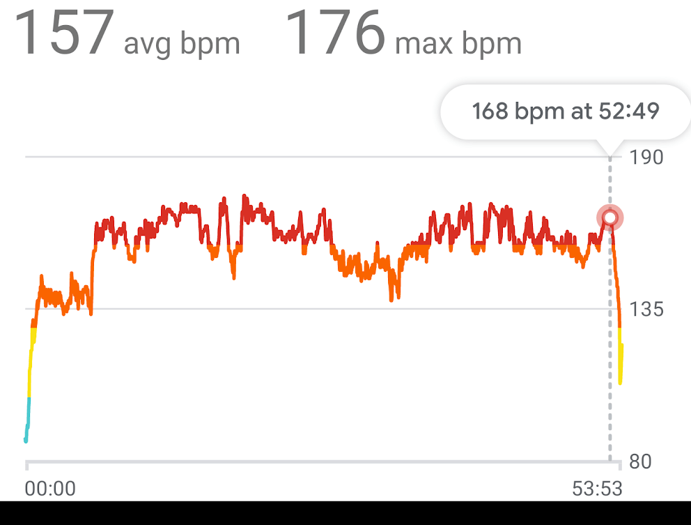 My heart rate was under control for almost the entire race, peaking at 176 beats per minute but mostly hovering comfortably just below 160: