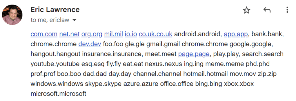 Alert readers might immediately note: “Hey, that’s also true of .com, the most popular TLD– COM files have existed since the 1970s!” That’s true, as far as it goes, but it is fair to say that .com files are rarely seen by users any more; on Windows, .com has mostly been supplanted by .exe except in some exotic situations. Thanks to the popularity of the TLD, most people hearing dotcom are going to think “website” not “application”.