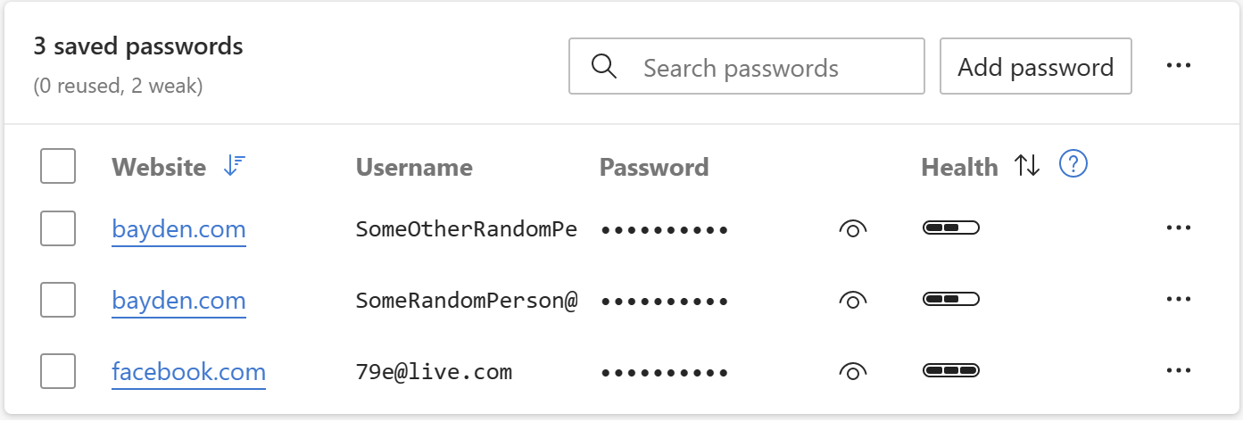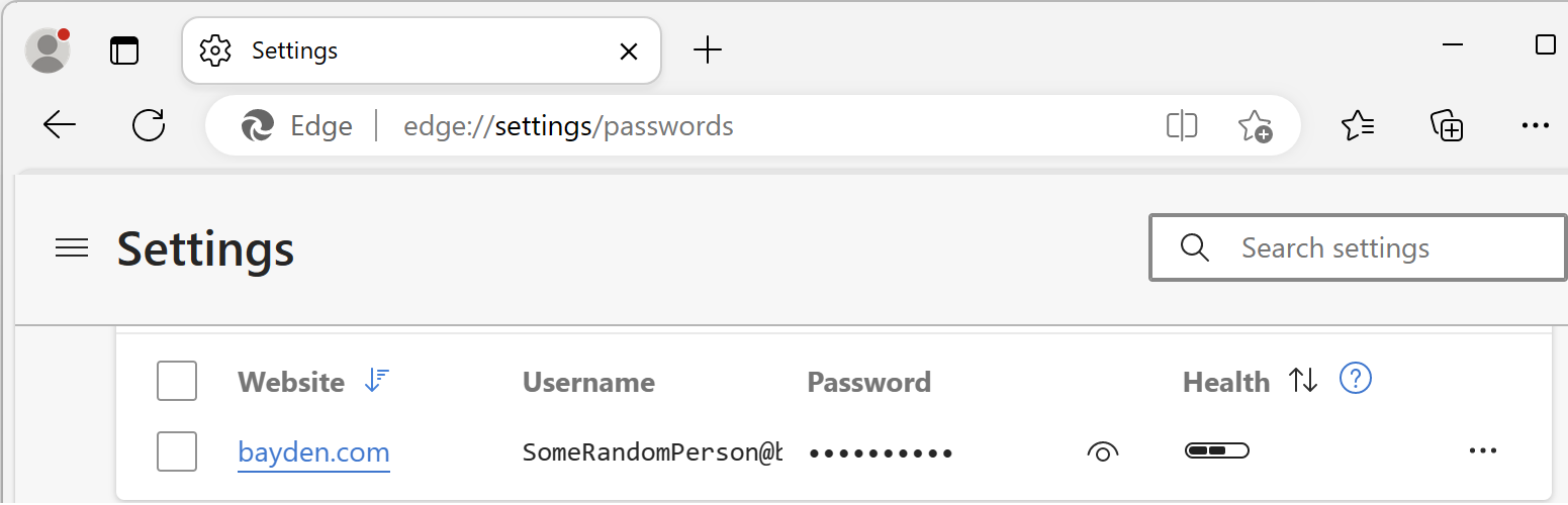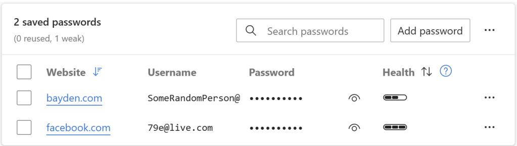 You will find that the passwords stored in that MSA/AAD sync account now appear in the local password manager, in addition to any credentials you stored before enabling sync. So, for example, we see the stored SomeRandomPerson@ cred, as well as the 79e@ credential that was freshly sync’d down from my Hotmail MSA account:
