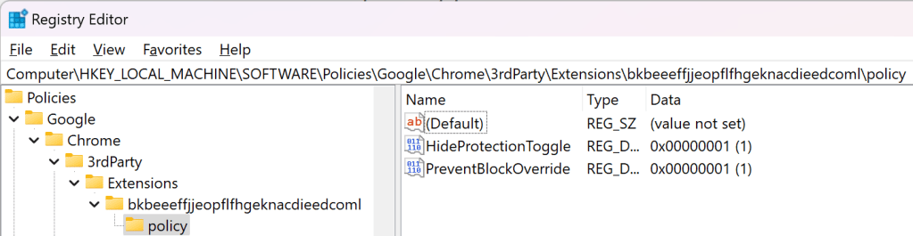 [HKEY_LOCAL_MACHINE\SOFTWARE\Policies\Google\Chrome\3rdParty\Extensions\bkbeeeffjjeopflfhgeknacdieedcoml\policy]