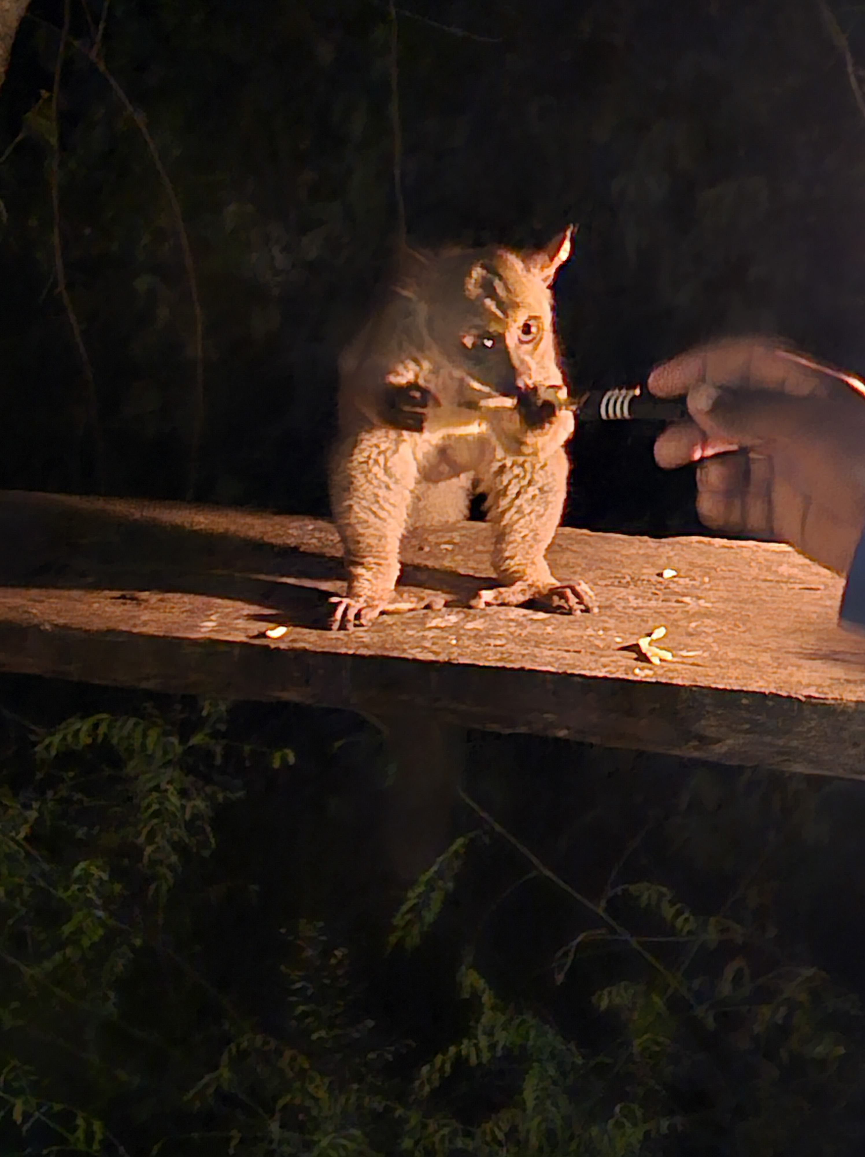 After dusting off and dropping stuff back in our private hut, we meet again in the common hut for dinner (soup, salad, meat, rice) and hang out in the dark. Some of our group watch the feeding of a “bush baby”, but I mostly miss it.