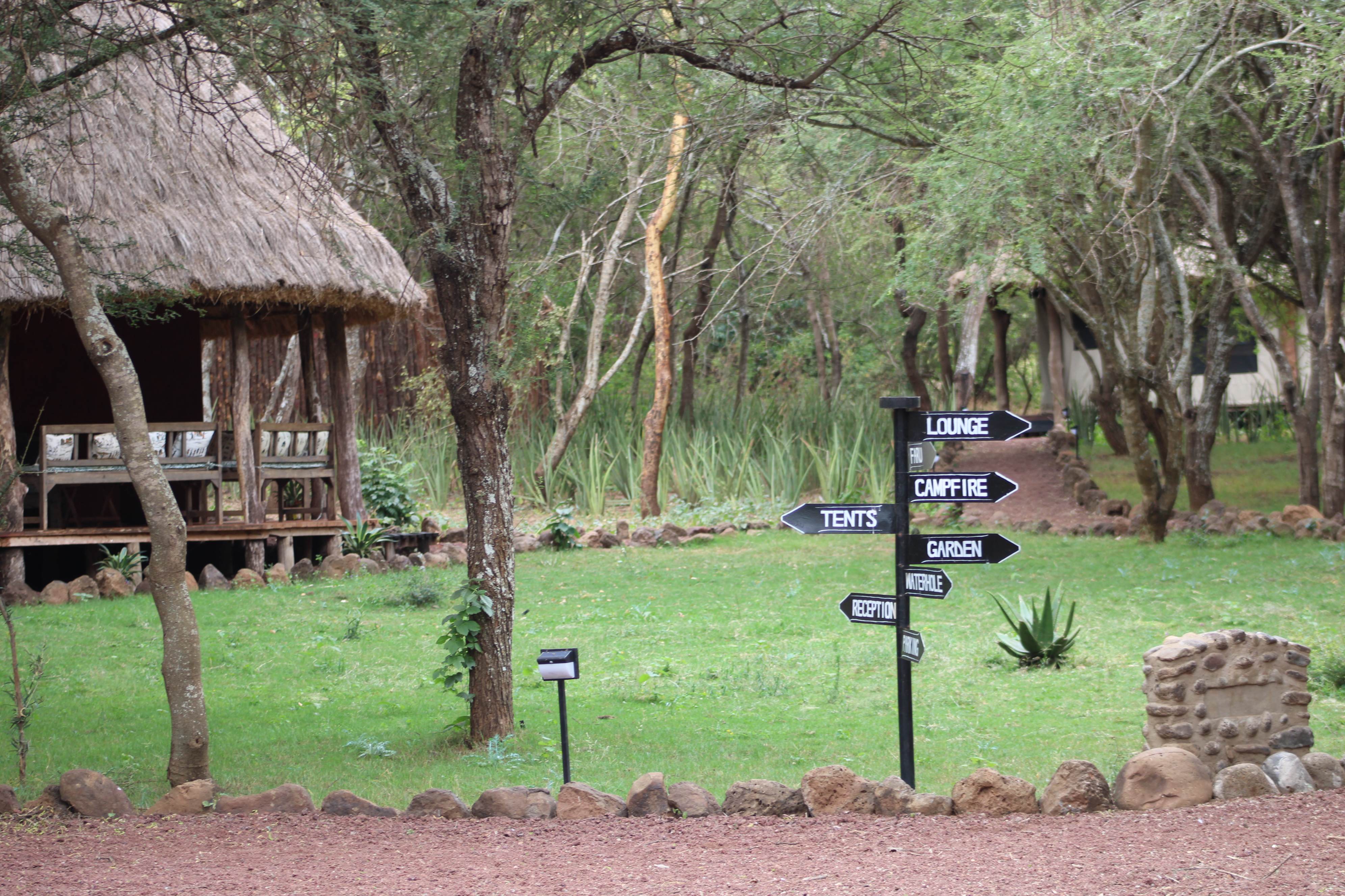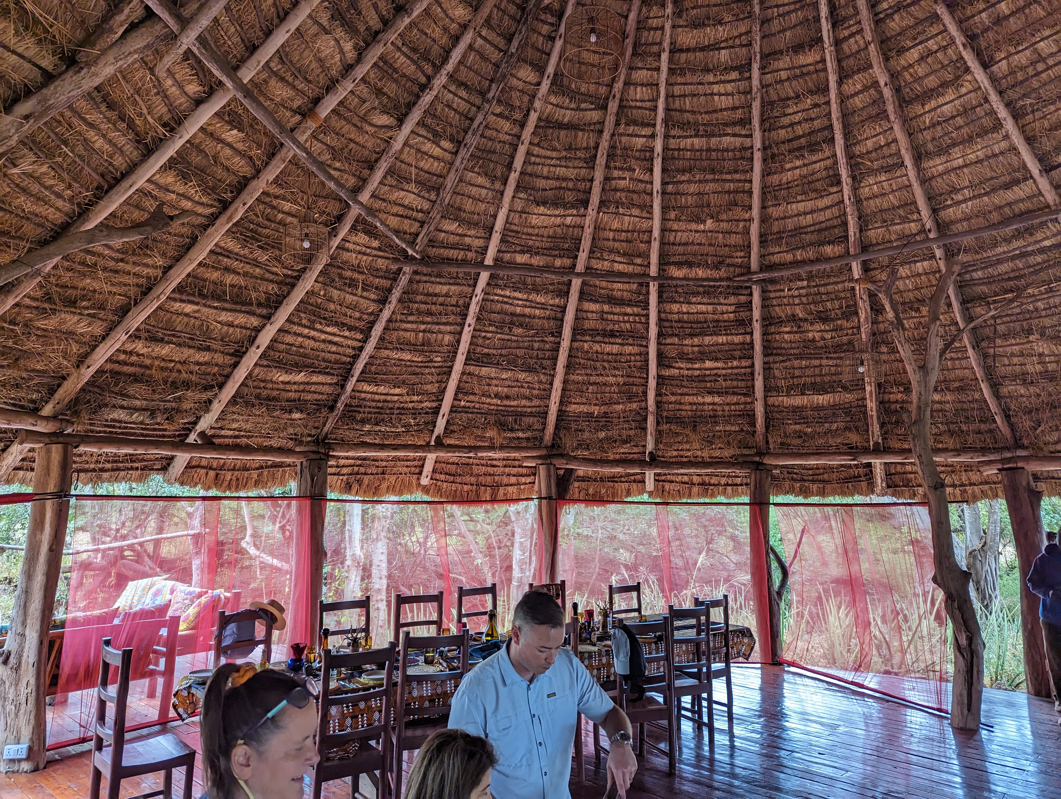 When we finally arrive at the lodge, the compound is scenic and very rustic, far away from the nearest paved road. We have a quick briefing in a mid-sized hut full of sofas where we get our private hut assignments and those of us with gear shed some of it to our new friends (mostly water bottles, bandanas, and smaller items not available for rent). In contrast to our trip so far, we see mosquitos around; not long after this I notice that I’ve gotten my first and only bite of the trip. I really hope my anti-malarial drug works!
