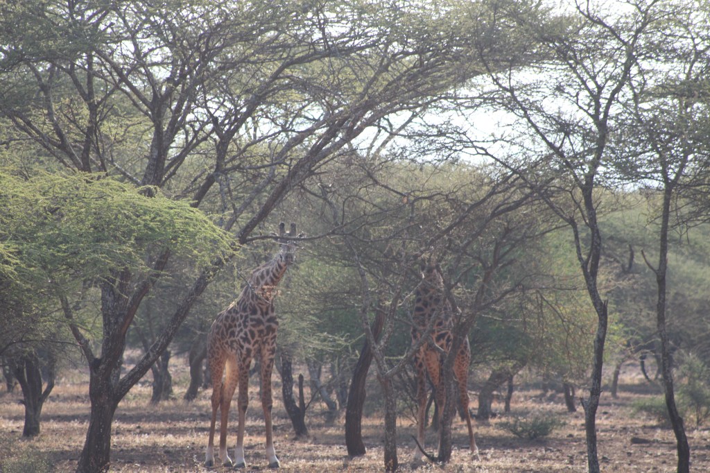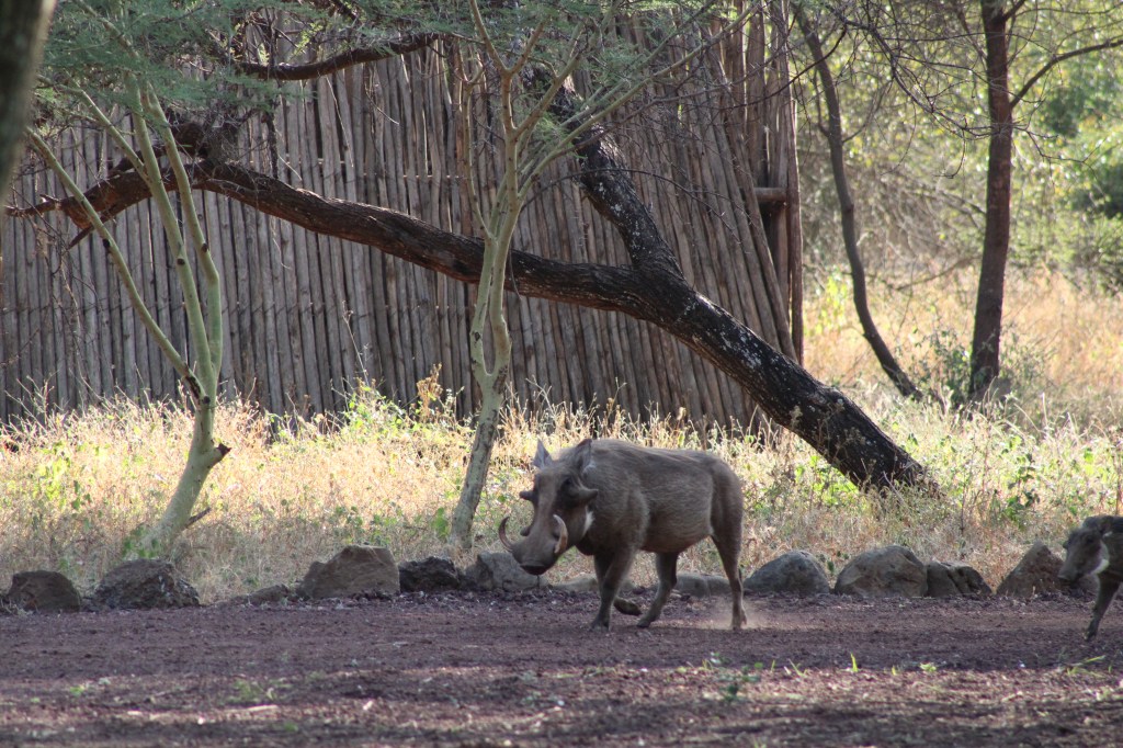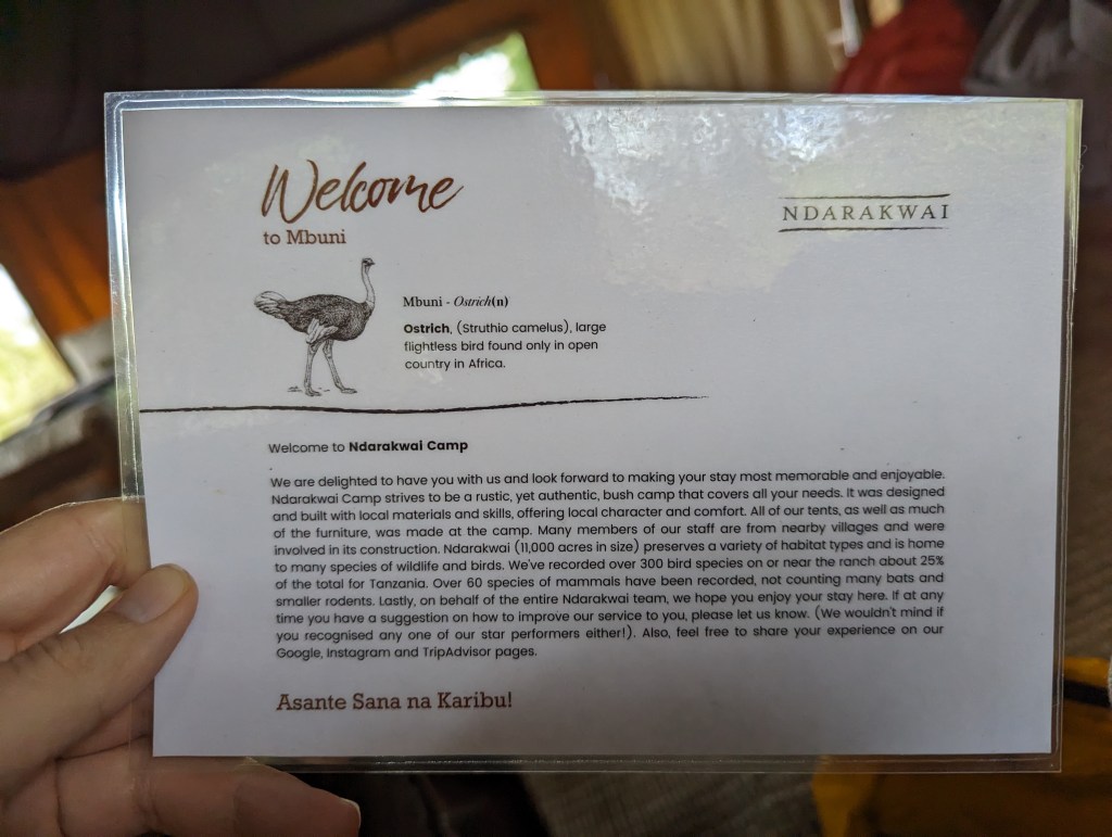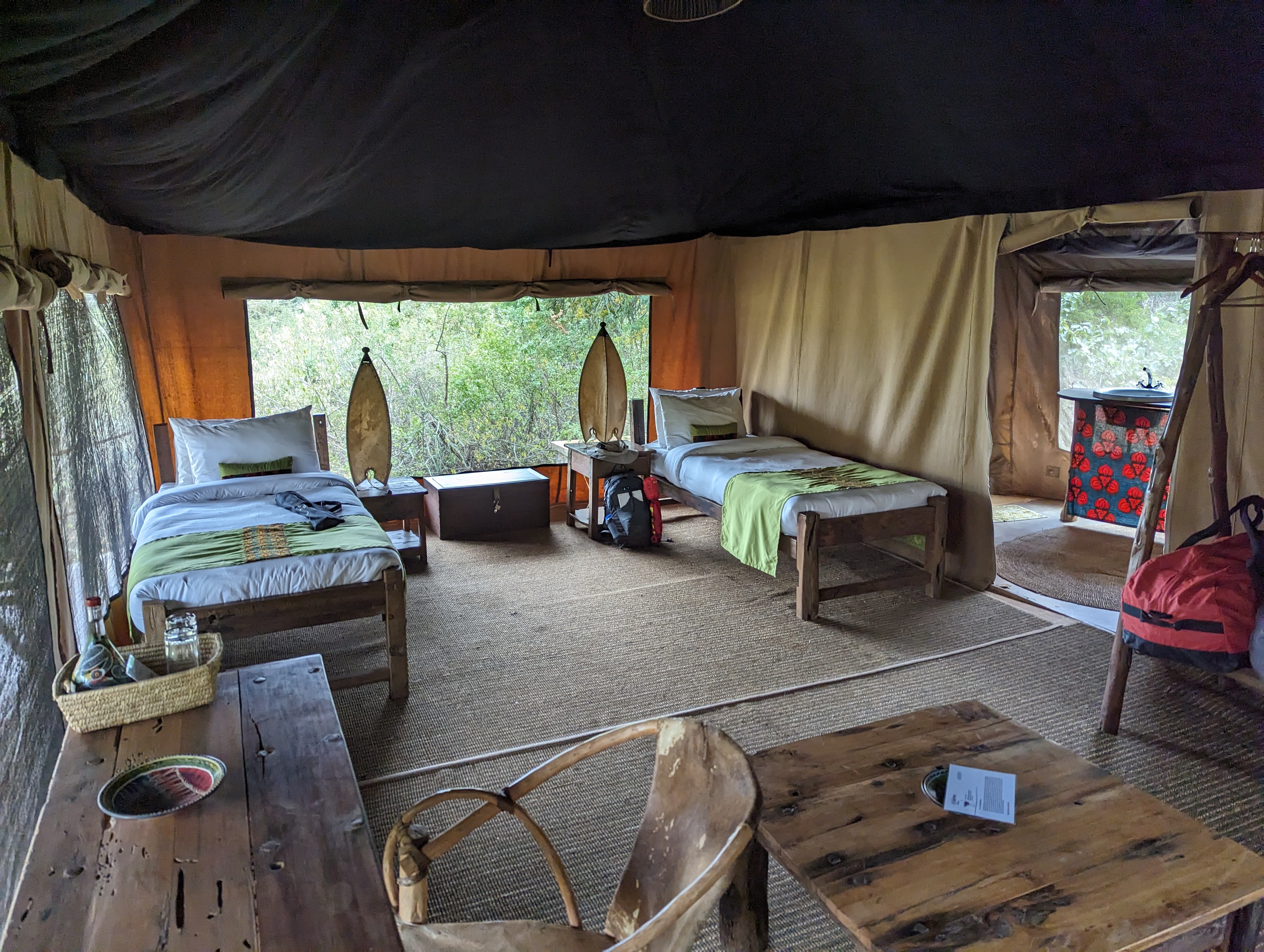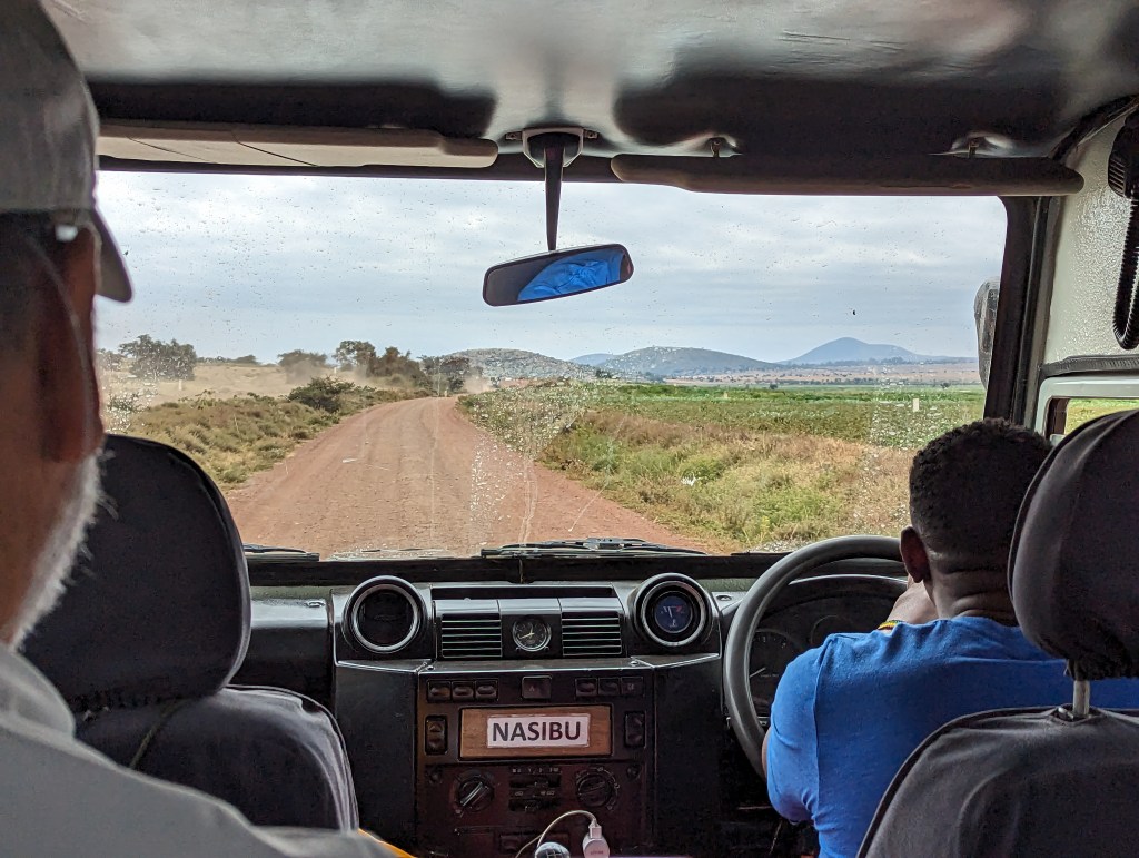 A bit behind schedule (meant to leave at 10a, we didn’t depart until 11:45), we grabbed all of our luggage and split up into the two Land Rovers for the drive (~45 minutes?) to Ndarakwai Ranch. After driving on paved roads for about 30 minutes, we turn off onto an unpaved dirt road and head into the countryside. There are grazing giraffes and later a small Maasai village alongside the road.