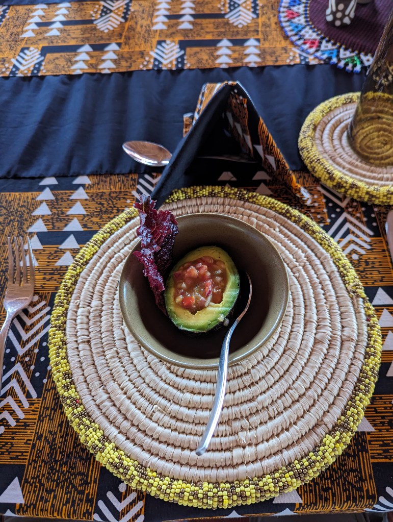 After dropping our bags, we meet with our team for lunch in the biggest common hut, which has a fireplace, sofas, a small bar, and a long table for meals.