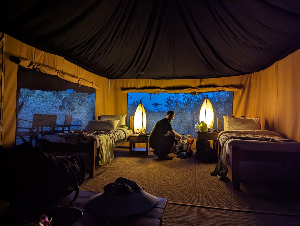 Jason and I are assigned to share the “Mbuni” (Ostrich) hut, a 2 minute walk up a gravel path from the center of the camp. It’s dreamy. A cool breeze crosses from one screened side to the other 15 feet away, and birds, monkeys, and other animals chirp and chitter pleasantly outside. Within its canvas walls, there’s a bathroom with a solar-heated shower, sink, and regular toilet. There are no power sockets, but there are two electric lamps and one bulb overhead in the bathroom area.