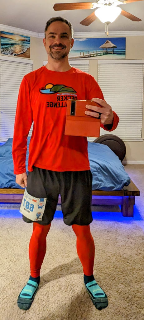 I left the house around 6:45 for the 7:30 am race. While waiting at a light in the parking traffic I concluded that I definitely was going to need that second shirt, so I put it on under my trusty Decker Challenge shirt that brought me to the top of Kilimanjaro.