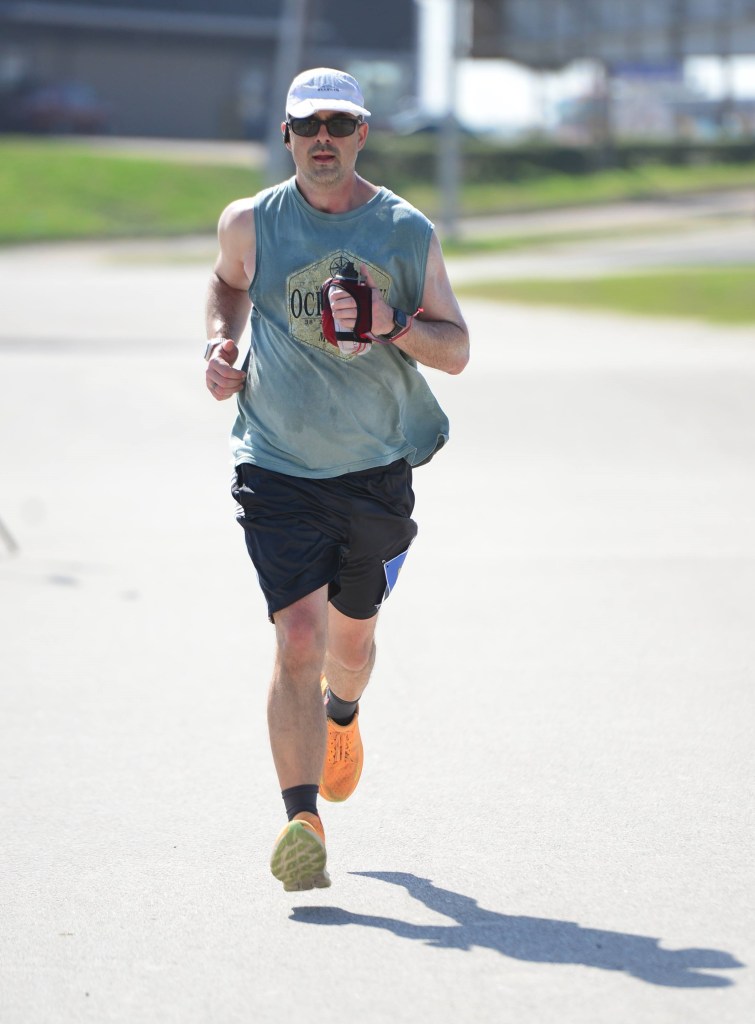 Between the humidity and the sun, I was increasingly dehydrated through the second half of the race, eventually refilling my water bottle at every aid station and emptying it before the next. Fortunately, sweating so much meant that I barely needed to pee (other than at the start/half/finish line, this race has just 3 porta-potties along the course). Having eaten two packs of Sport Beans in the first half (100 calories each), in the second I consumed 4 GU Liquid Energy packs (also 100 calories each). I probably should’ve had a couple more.