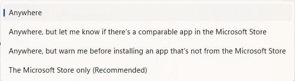 - Anywhere, but warn me before installing an app that’s not from the Microsoft Store