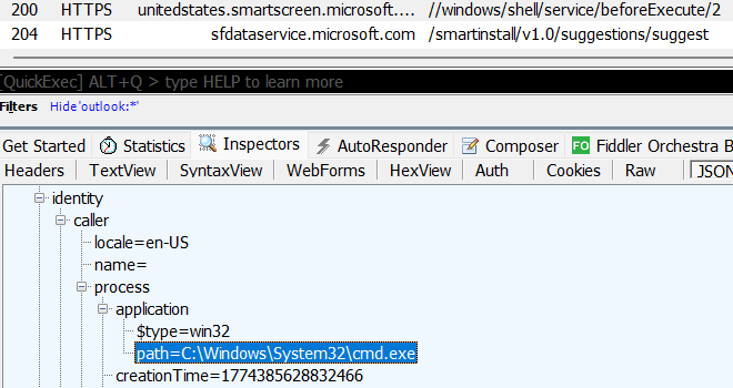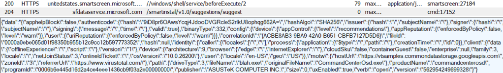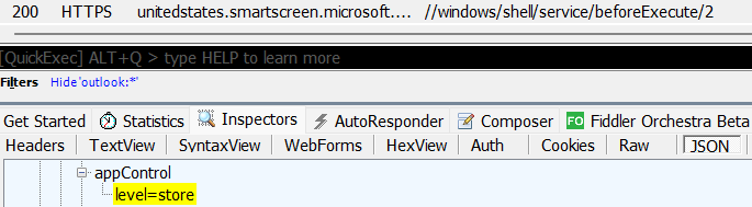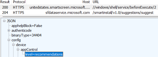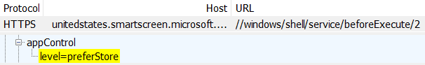 …mean the SmartScreen Application Reputation call is sent specifying either appControl/level=preferStore (Warn) or appControl/level=recommendations (LMK) values: