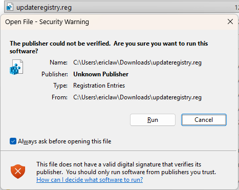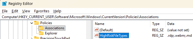 Another interesting surprise is the behavior in Windows when the filetype is a “Dangerous” one but not an “App.” Those dangerous file types may be specified in the registry by an application’s developer, or manually using the HighRiskFileTypes registry key: