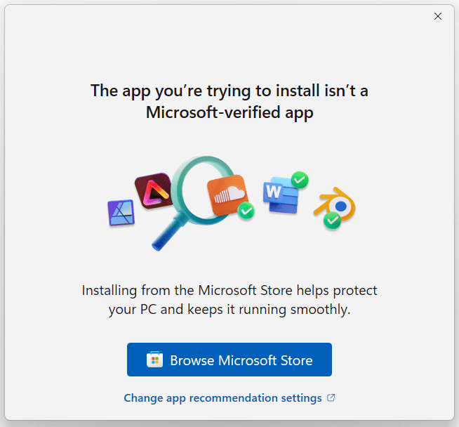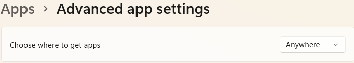However, if Windows is configured to Get Apps from Store Only, the opening of an Internet Zone MotW-bearing file is blocked silently, providing a kludgy version of one of the most exciting aspects of the Smart App Control feature.