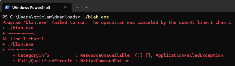 Attempting to run such a file by calling ShellExecute with SEE_MASK_FLAG_NO_UI results in a silent failure (no prompt); the function will return an error code of ACCESS_DENIED.