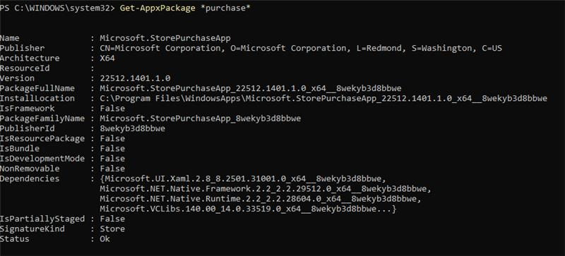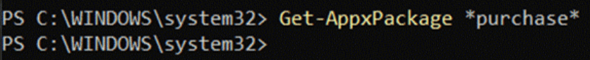 Normally, running Get-AppxPackage *purchase* from PowerShell should show this:
