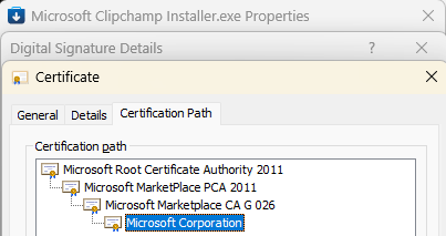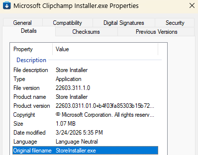 PS: On subtle behavior is that the Microsoft offers “Portable Store Installer” executables to allow apps to “download” from websites (e.g. this one for ClipChamp). Such PSI installers have an Original filename of StoreInstaller.exe and they are signed with a specific Microsoft certificate chain. The “Choose Where to Get Apps” feature recognizes these installers and allow-lists them as if they came from the store (because, logically, they do).