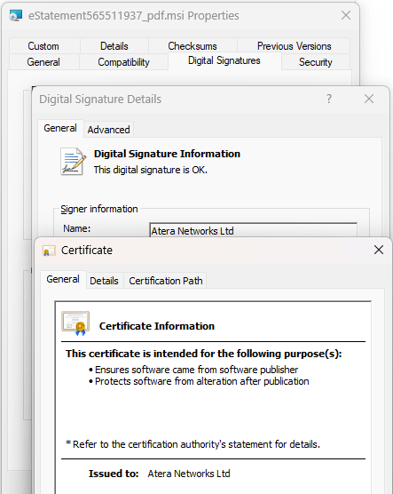 Hrm. Maybe the company got hacked and someone stole their certificate to sign malware? Looking more closely at the file information, we see that it was signed on April 13th and the file information looks legitimate “This installer database contains the logic and data required to install AteraAgent.” rather than what an attacker might pick (e.g. “You’re Social Security Info. Open me hurry hurry hurry.”)