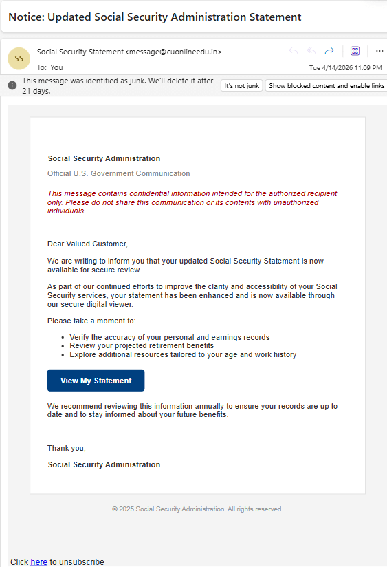 After you sign up on the Social Security Administration’s website, they’ll send you a yearly email inviting you to check out your benefits. Flipping through my Junk Mail folder this afternoon, I found the following email: