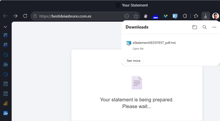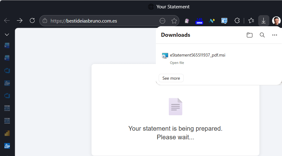 When that page loads, it claims that your “statement is being prepared” and a file download appears. The file download, named (eStatement####_pdf.msi) is an Windows Installer package named to make it look like a PDF file.