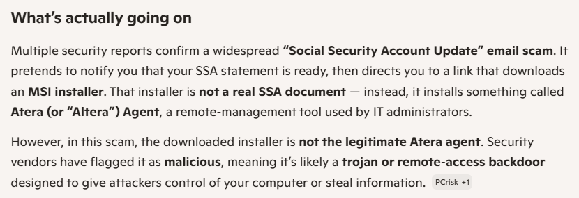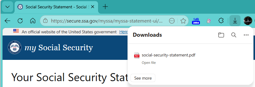 After kicking off the MSI file download, the attack site navigates to a legitimate page on the Social Security site.