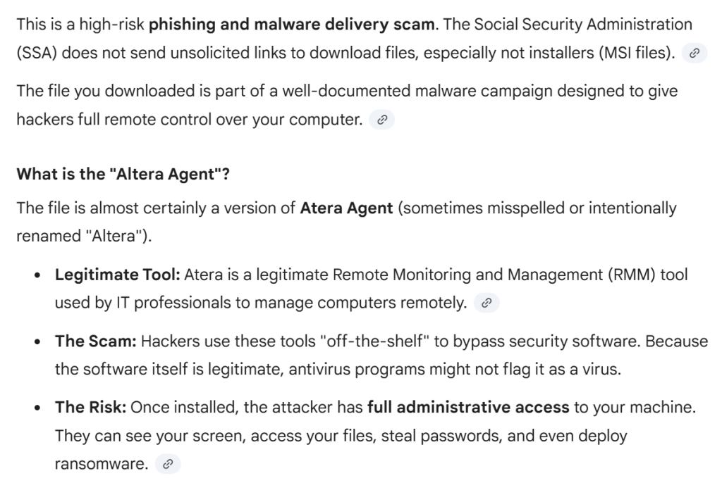 Gemini gets it right — the file is legitimate, but it’s being used. The Altera Agent is a piece of software that is categorized as a Remote Monitoring and Management (RMM) tool, which might be referred to by another name: a backdoor.