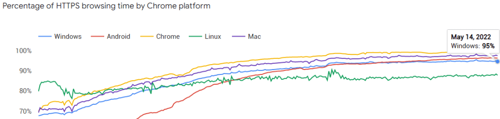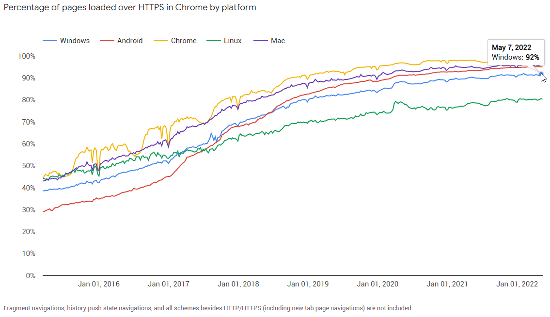 Browsers are working hard to get these numbers up, by locking down non-secure HTTP permissions, blocking mixed content downloads, and by attempting to get the user to a secure version of a site if possible (upgrading subresource loads, a.ka. mixed content, and upgrading navigations).