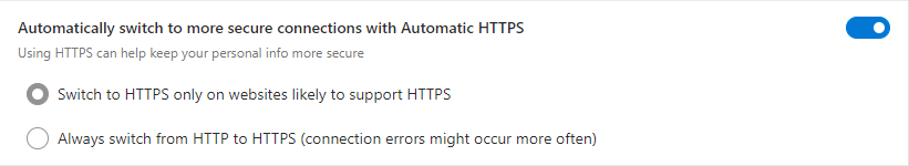 This means, among other things, that new browser features that upgrade non-secure HTTP requests to HTTPS must not attempt to upgrade the probe requests, because doing so will prevent successful hijacking. To that end, Edge’s Automatic HTTPS feature includes a set of exclusions:
