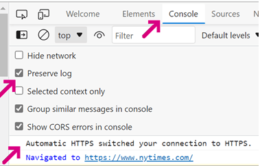 You can see whether Edge’s Automatic HTTPS feature upgraded a request to HTTPS by looking at the F12 Console tab: