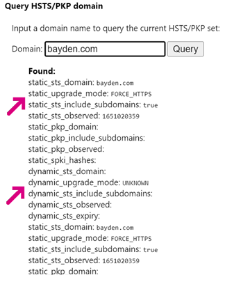 If the static_upgrade_mode value shows FORCE_HTTPS, the site is included in the HSTS preload list. If FORCE_HTTPS is specified in dynamic_upgrade_mode, the site sent a Strict-Transport-Security opt-in header.