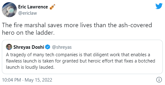 We have to take care not to incentivize behaviors that result in great stories of “heroic firefighting” while neglecting the quiet work that obviates the need for firefighting in the first place. But quantifying the impact of the fire marshal can be difficult– how do you estimate the cost of a conflagration that didn’t happen? (This is one argument for investing in post-mortems— it allows for ballpark estimates of historical recovery costs, helping everyone understand that prevention is a relative bargain).