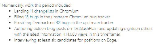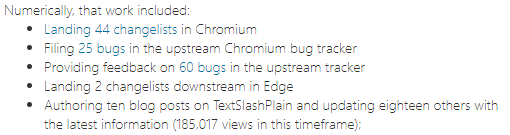 Amid the Principal band, I’ve found it challenging to try to predict where the greatest opportunity for impact lies. For the first two years back at Microsoft, I was unexpectedly impactful, as (then) the only person on the team to have ever worked as a Chromium Developer– I was able to help the entire Edge team ramp up on the codebase, tooling, and systems. I then spent a year or so as an Enterprise Fixer, helping identify and fix deployment blockers preventing large companies from adopting Edge. Throughout, I’ve continued to contribute fixes to Chromium, investigate problems, blog extensively, and try to help build a great engineering culture. Many of these investments receive and warrant no immediate recognition– I think of them as seeds I’m optimistically planting in the hopes that one day they’ll bear fruit.