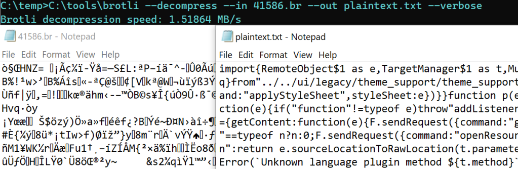 If you want a better look inside of a PAK file, you can use the unpack.bat tool, but this tool does not yet support decompressing brotli-compressed data (because Brotli support was added to PAK relatively recently). If you need to see a brotli-compressed resource, use unpack.bat to get the raw file. Then strip 8 bytes off the front of the file and use brotli.exe to decompress the data.