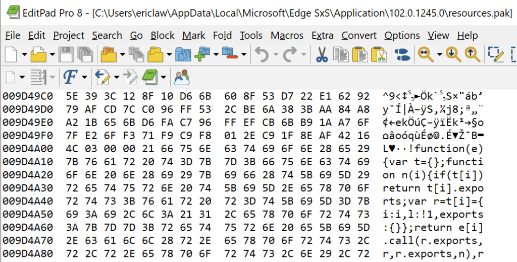 Unfortunately for the curious, PAK is a binary format which is not easily human readable. Beyond munging many independent resources into a single file, the format relies upon GZIP or Brotli compression to shrink the data streams embedded inside the file. Occasionally, someone goofs and forgets to enable compression on a resource, bloating the file but leaving the plaintext easy to read in a hex-editor: