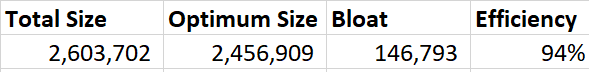 You can then run PNGDistill on the extracted PNGs and discover that our current PNG compression efficiency inside resources.pak is just 94%, with 146K of extra size due to suboptimal compression.
