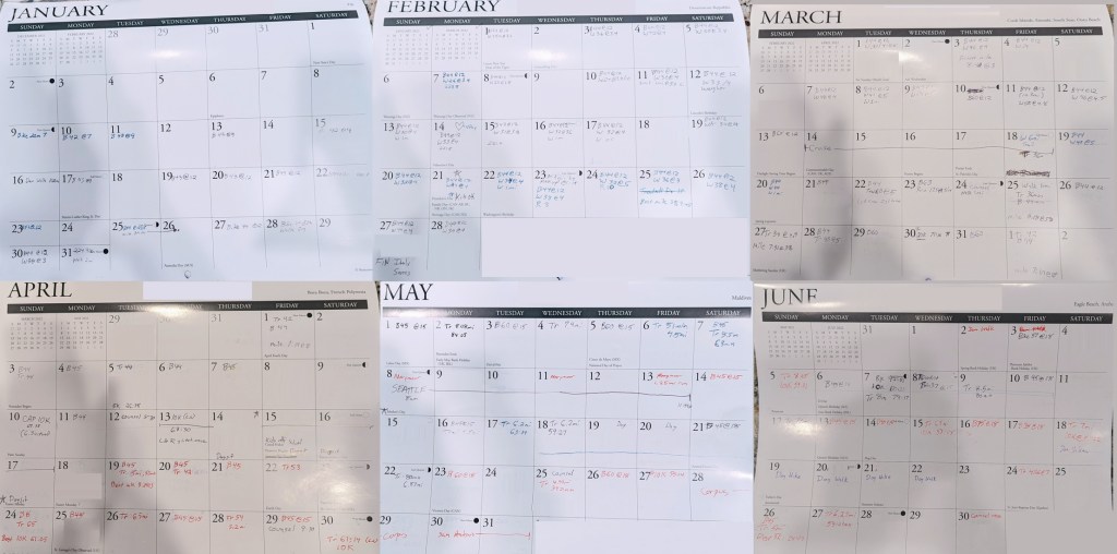 Beyond letting my devices track my weight and workouts, I also have a paper calendar and a notepad; these are both a backup, and a tangible reminder of the progress I’ve made.