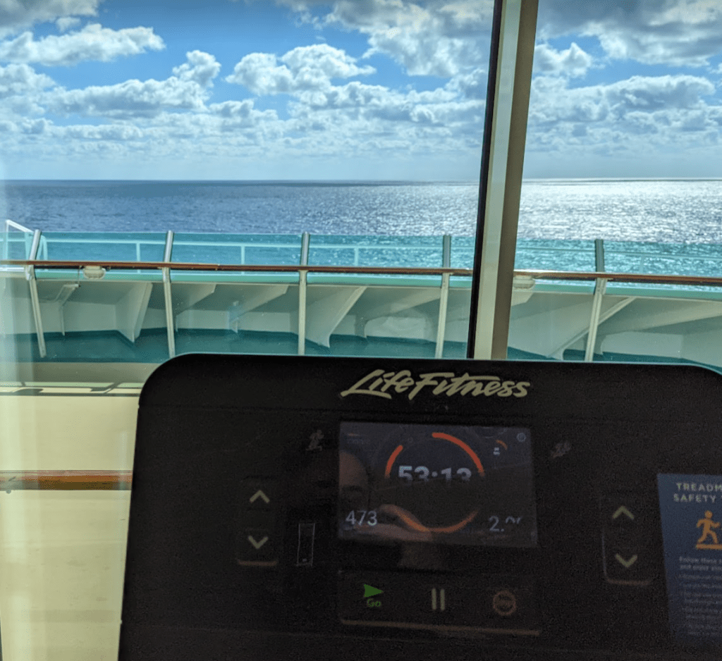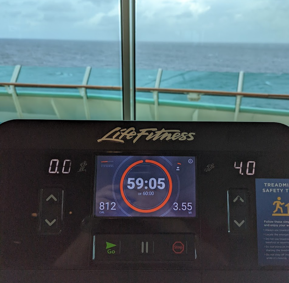 In the morning, I had breakfast and headed to the gym, determined to push myself. After over an hour on the treadmill, I walked another two miles or so on the deck, happily enjoying the breeze as sweat poured everywhere.