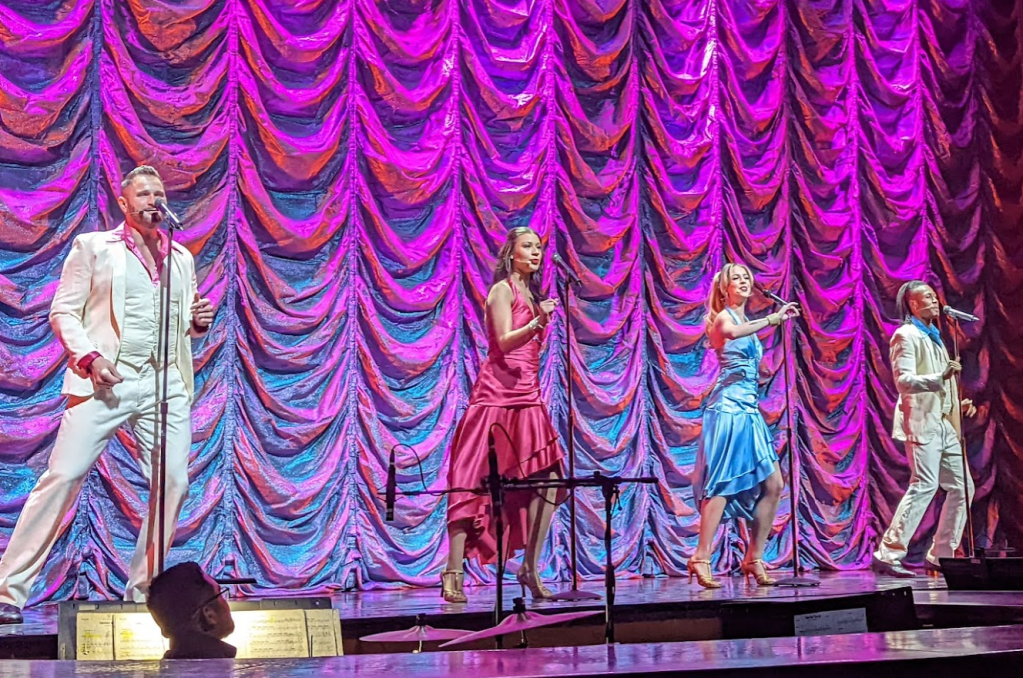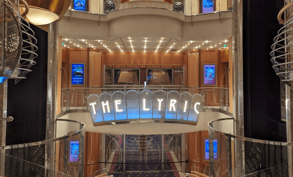 I headed to the “Welcome Aboard” show in the Lyric Theater at 7pm– the Cruise Director opened by asking the audience the usual questions: “How many of you are celebrating a birthday? A honeymoon? An anniversary?” with the expected jokes about the sparse attendance of honeymooners (“They’re busy in their rooms, I suspect”) and muted enthusiasm of the anniversary celebrators (“They’re a lot less excited than the honeymooners”). She finally joked “How many of you are celebrating a divorce?” and I couldn’t help but hoot and raise my now mostly-empty glass, the Old Fashioned it formerly contained now lightening my mood. There was a bit of laughter in the audience as she quipped “Well, y’all know where to find him this whole trip, up in the Blue Moon club” while miming a disco dance routine.