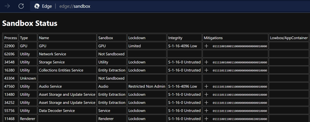 Beyond the information shown in the Task Managers, you can also see information about the security restrictions used to sandbox each process by visiting edge://sandbox: