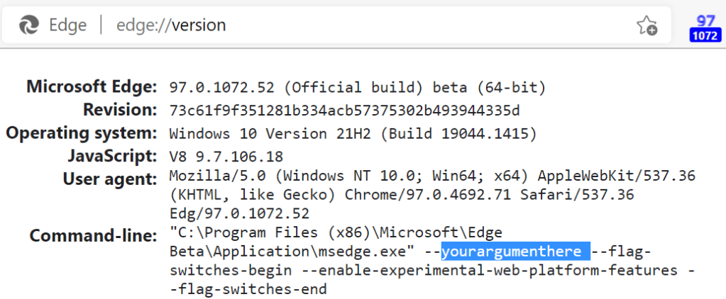 You can verify that the current Edge instance you’re using has a desired command-line argument by visiting edge://version and looking for the Command-line value in the page: